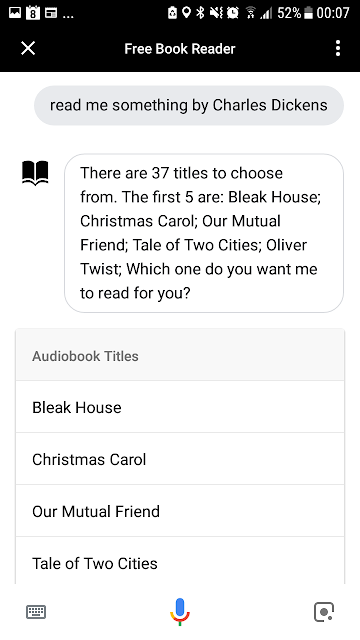 So for example, you can set up a routine like below, where saying "read a tale of two cities" will send "Ask Free book reader to read a tale of two cities" to Google assistant, and it will start reading the book.