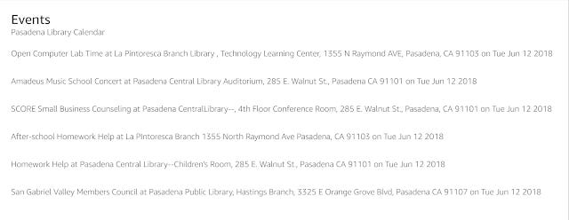A variant is Pasadena Library Calendar that allows you to ask for events from those library. Similar ones exist for Universities like Princeton Calendar , iSchool University of Illinois Calendar etc