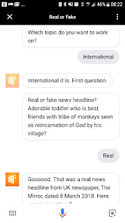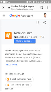 Real or Fake - a lot of libraries now consider themselves an active player in the fight against Fake news - the National Library Board in Singapore does this as well with the S.U.R.E (Source, Research, Understand and Evaluate) campaign an initiative by the National Library Board, and they have a game on Google assistant for users to try their skills to determine if a piece of news headline is Fake news or not. It's a simple game, you get to choose either local news or international news and you get challenged with 4 news headlines and you have to guess if they are fake news or not. It was more entertaining then I expected.