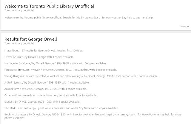 The most interesting bit? "This skill is not sponsored by Toronto Public Library, and uses the available public open data API." - The power of open data API!