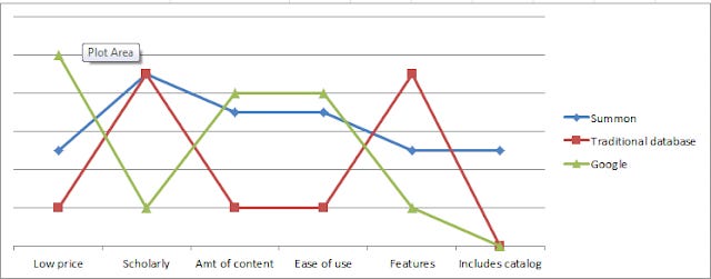 You see divergence in the value curves of web scale discovery and traditional databases, discovery services raise the factors of ease of use compared to library databases as well as authoritativeness of results compared to Google. Throw in the addition factor of including the library catalogue - "The one search" concept and you have a unique value curve.