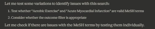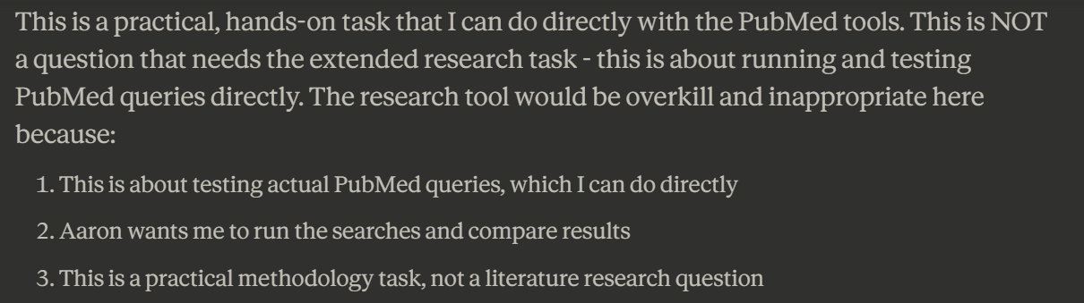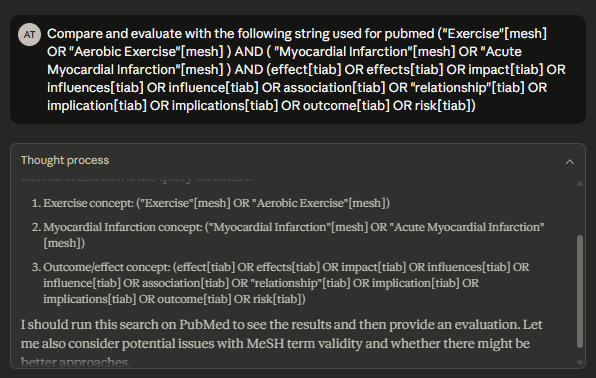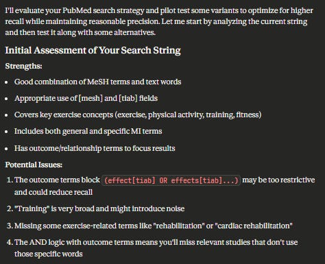 Evidence synthesis experts might critique the specific choices of what to test and judgments made while thinking, but that misses the point: it is now capable of testing search strategies in PubMed!