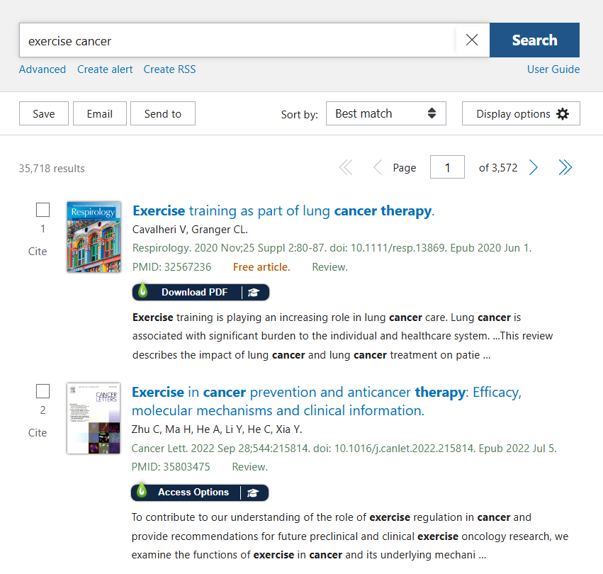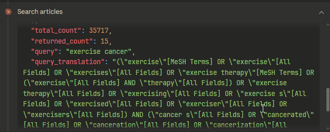 I confirmed this was working as expected by running the same query through PubMed’s web interface: I got 35,718 hits (one more than the MCP server for some odd reason). The top 15 PMIDs matched what I got sorting by “Best match” in this case, though I have seen it query with “most recent” sorting in some cases as well.