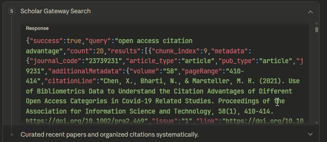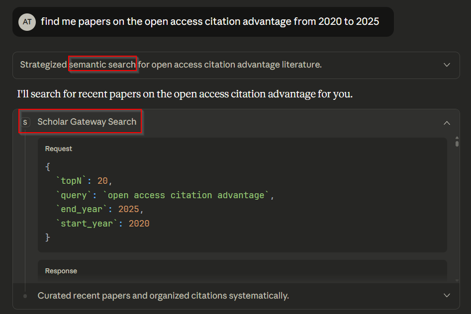 You can see my prompt and Claude “thinking” and “deciding” to search for papers by calling the Scholar Gateway Search with what Claude calls a “semantic search”.