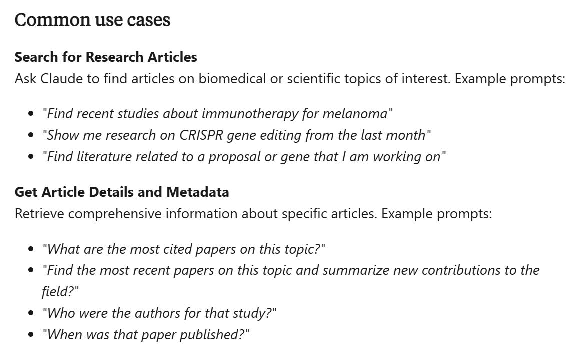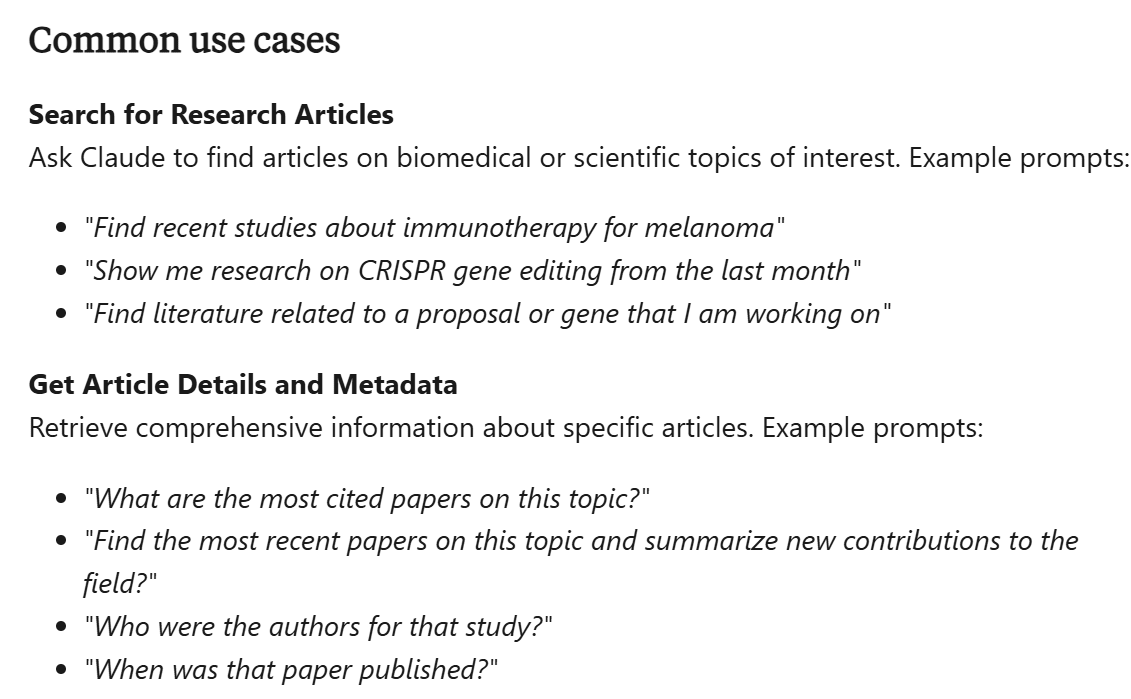 It can “search articles”, “Get article metadata” and also retrieve 8 million full-text via PMC.