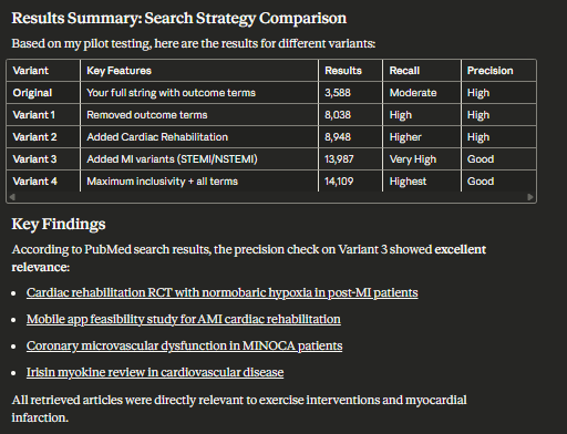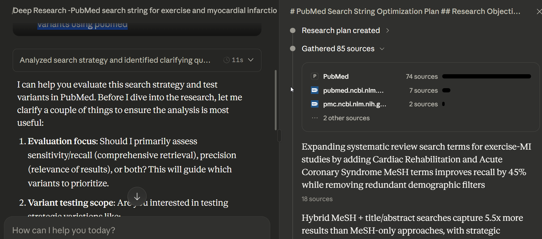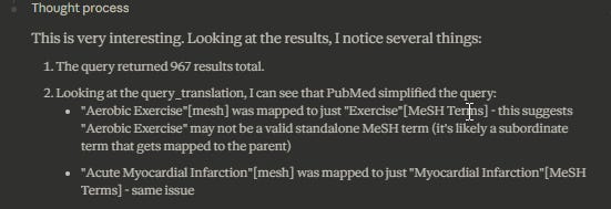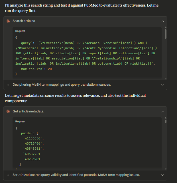 LLMs can now pilot-test Boolean search strategies: This is huge for evidence synthesis. Rather than generating search strings blindly, Claude can actually run searches against PubMed, check MeSH headings, and iteratively refine strategies
