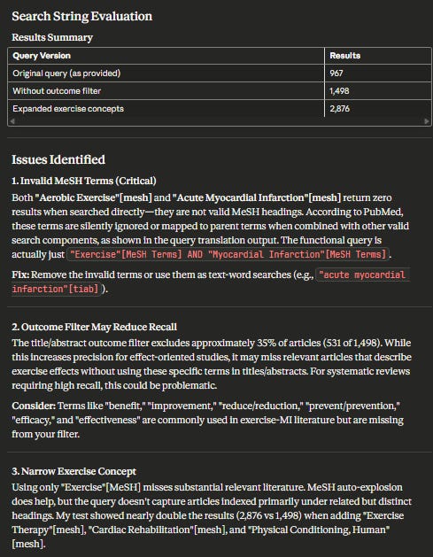 When I asked Claude to evaluate a Boolean search strategy, it: