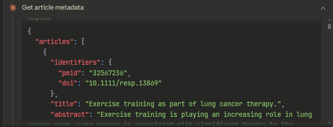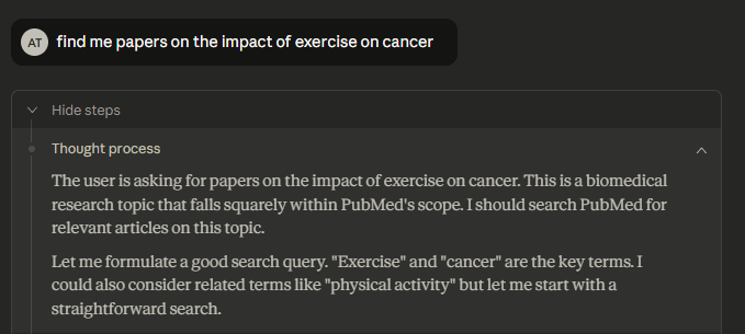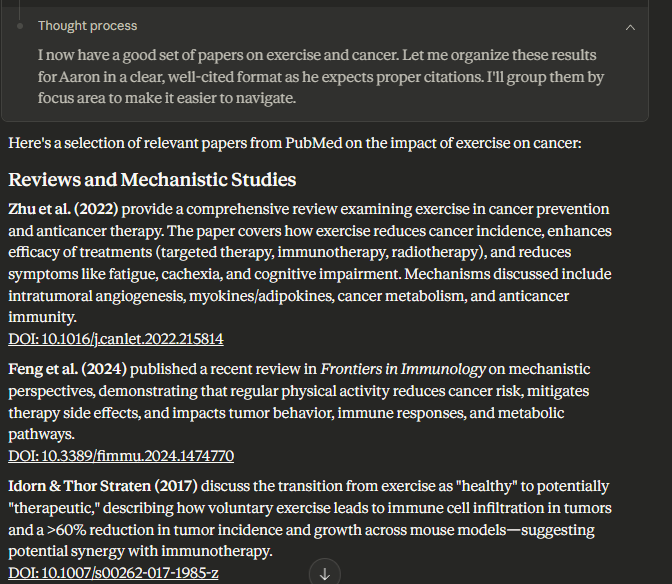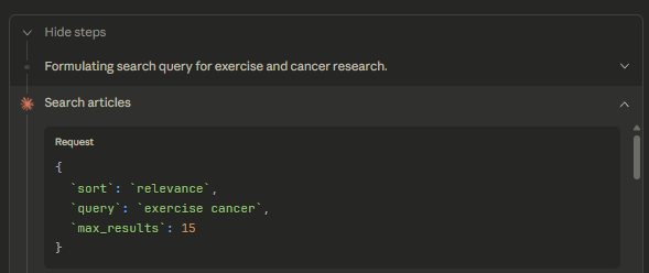 Lots of testing needed to see what this connector is capable of but for my first test searching for papers on impact of exercise on cancer, Claude was somewhat lazy—it went with the simplest possible query: