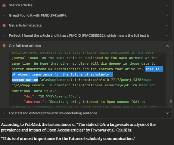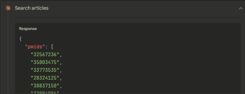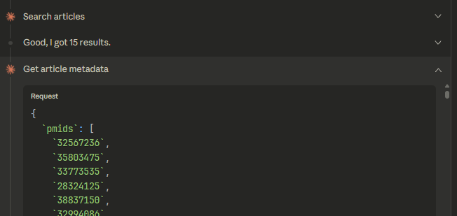 Claude then used those 15 PMIDs to request article metadata (title, abstract, etc.) and generated an answer from there.
