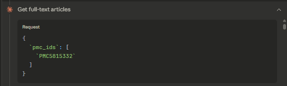 As you can see from the tool list, this Pubmed MCP server can also ask for full-text. But this is done only by feeding it PMIDs. Unlike the Wiley AI Gateway server (where you can get only chunks of text) you get the whole paper’s full-text (if available in PMC) in the response and not just chunks.