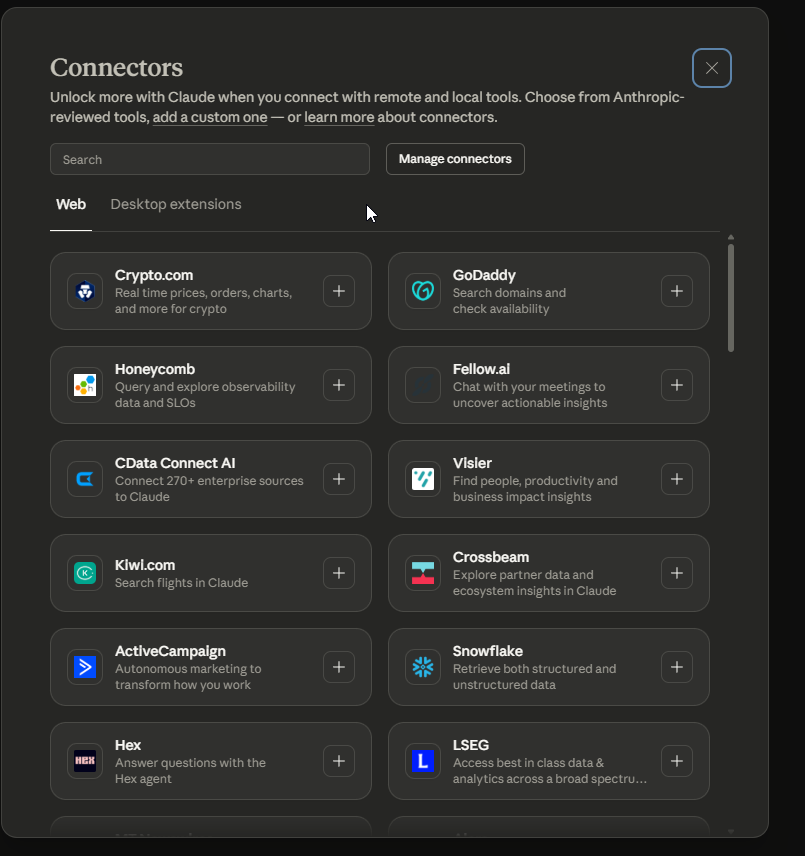 I will be using the Claude web interface (paid version needed) as the host/client and turn on connection to two specific connectors/MCP servers (connectors & MCP servers will be used interchangably) which are already available to be turned on without any additional setup.