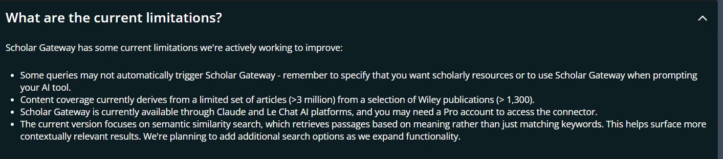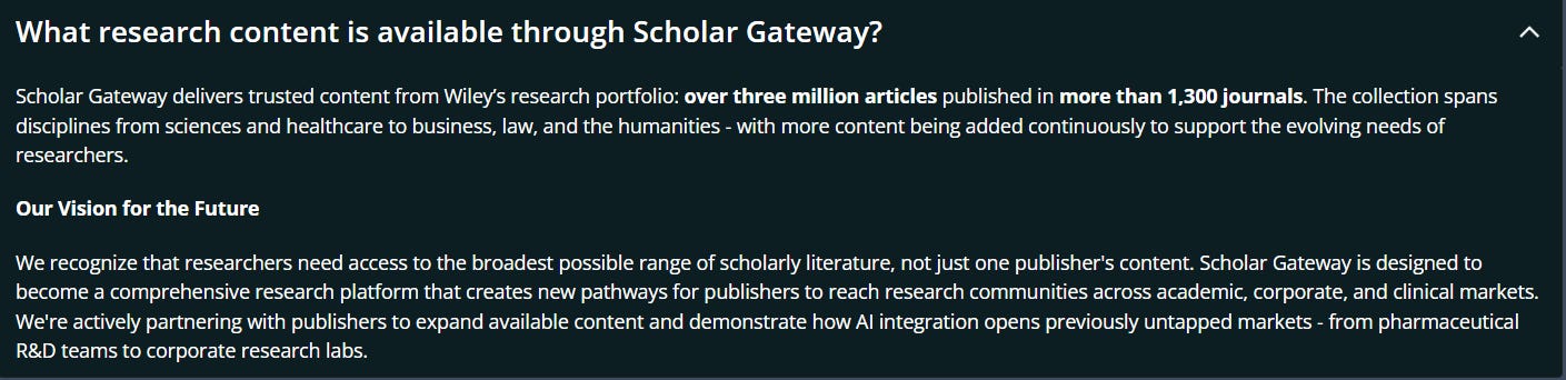 I am told they plan to be very transparent about how they measure quality, though they’re still finalising the exact format for disclosure. This is a bold and welcome step. We’ve always lacked this transparency from discovery vendors, and it raises the bar significantly. Given that Wiley AI Gateway is probably one of the first major academic MCP servers, hopefully it sets a standard for others.