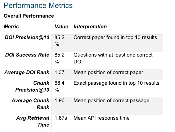 Looking at their evaluations (based on 750 questions from their test set), the DOI precision@10 of 85.2% makes sense. This implies that if you search for a paper by DOI, there’s a roughly 15% chance the correct paper doesn’t appear in the top 10. In fact, one of my first tests failed to retrieve a paper by DOI, initially making me think the tool couldn’t handle DOI retrieval at all.