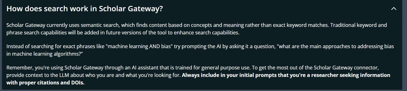 While the FAQ suggests I need to state that I am looking for schoarly resources or to use Scholar Gateway, I found it always used it correctly when needed, perhaps because I turned off the other connectors like default web search.
