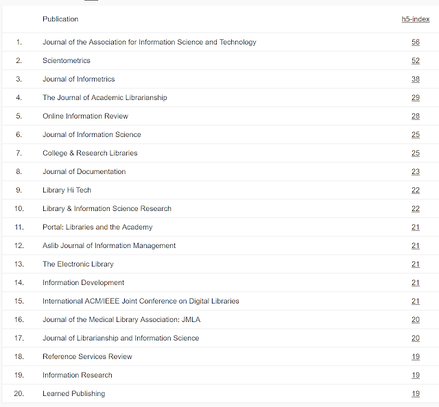 Microsoft's "Library Science" ranking of journals for the last 5 years for H-index is as follows for the top 20.