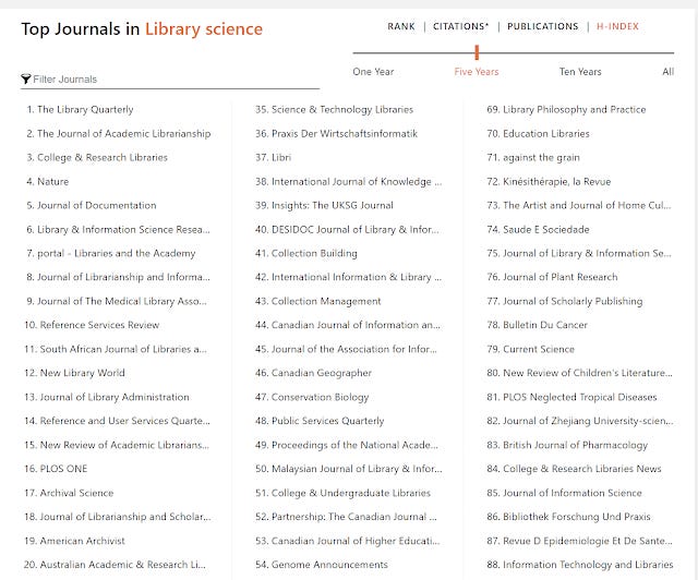 Compare this to Google Scholar's metric ranking of "Library & Information Science" journals by H5