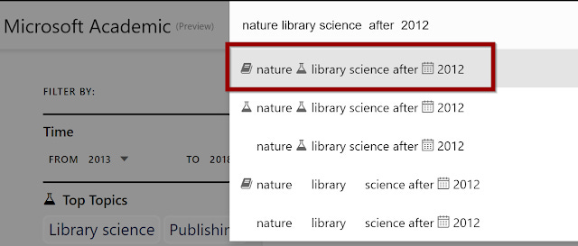 By typing slowly nature library science and after 2012 and selecting the drop down sugguestions, you can filter down to precise results that are in the journal Nature, have the topic "Library Science" and was published after 2012. I'll let you decide on your own if the articles included by Microsoft's auto tagging of topics is accurate enough or not.
