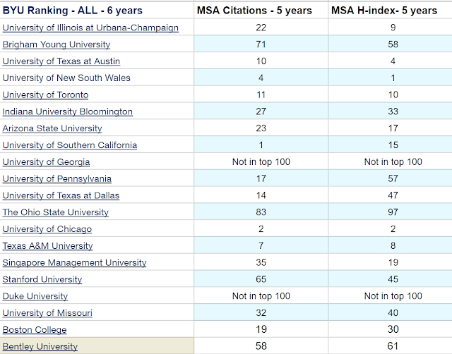 BYU accounting ranks (last 6 years) vs Microsoft Academic citations & H-index (last 5 years)