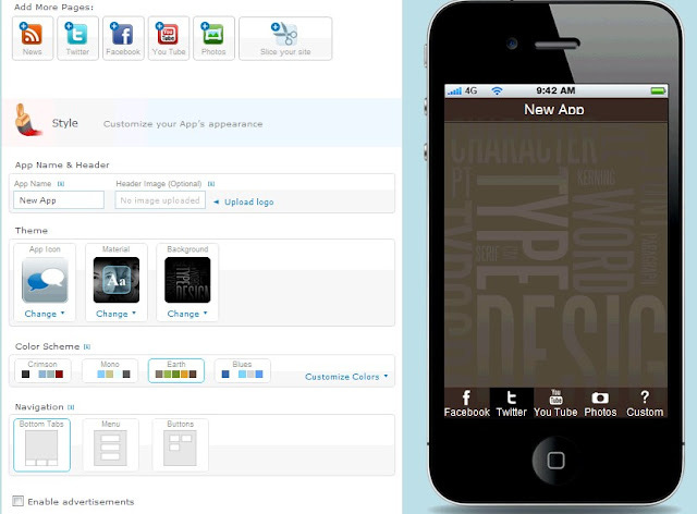 Above shows the "bottom tabs" style, you can also easily create menu style & buttons style. You can easily add social media accounts, "slice your pages" to display certain portions of your website & of course custom html pages. Personally one option I found missing was a simple link in the options that goes to another mobile friendly site. Instead it has to go to either one of the predefined social media accounts or to some custom html.