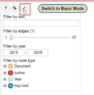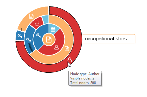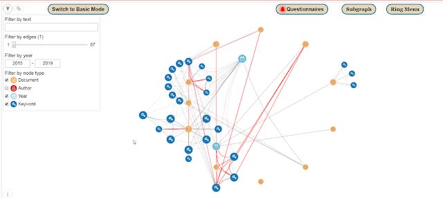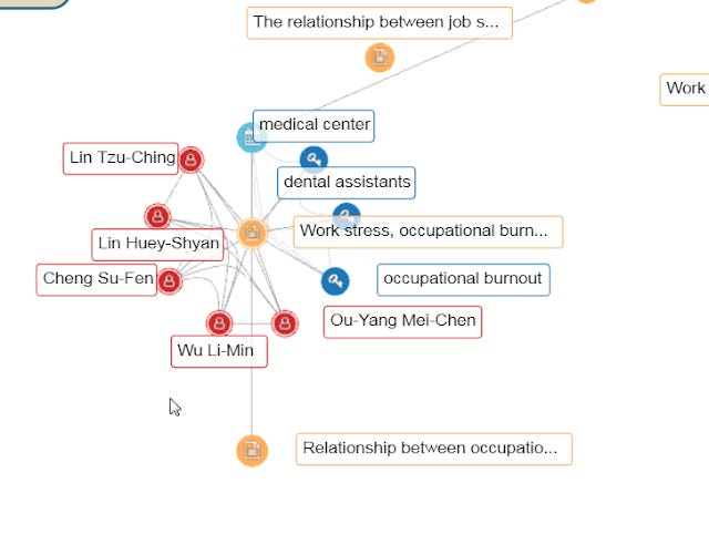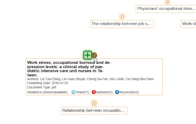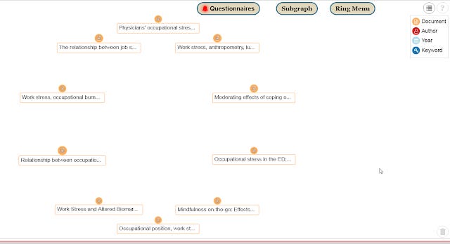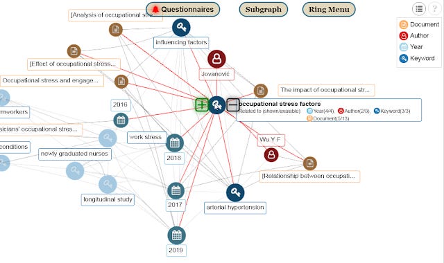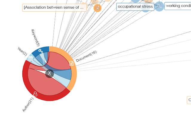 For example, the above graph shows that the keyword "Occupational stress factors" is used for 4 years (see the connections to the blue icons for 2016,2017,2018,2019), and is also co-used with 3 keywords. The keyword "Occupational stress factors" is actually connected to 13 documents but only 5 (denoted by yellow nodes) is shown as indicated by Documents(5/13). Similarly it is showing currently only 2 our of 8 authors nodes (in red) linked to this keyword.