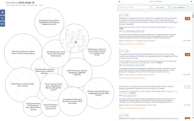 In the example below, I searched for the string word stress in Pubmed. the tool then takes the top 100 papers and visualizes them into clusters based on text similarity.