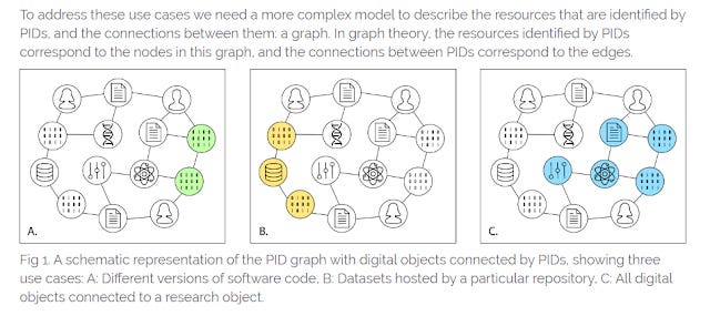 All in all this reminds me of the concept of a PID Graph mooted by Data Cite/Freya. With idea of linking various nodes representing research entities (e.g. publications, datasets, authors, funders etc) by Permanent IDs.