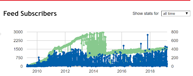 My Feedburner statistics - notice the plunge in subscribers in 2015 due to closing of Google Reader
