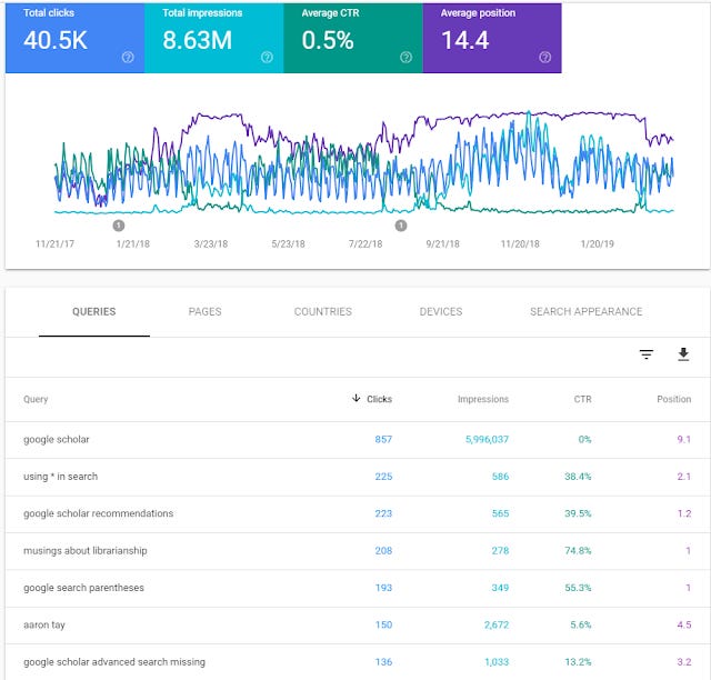 When I first started using Google Search Console, I was surprised by how high my blog ranked for many Google Scholar searches. For example, as you can see above, for the very general search "Google Scholar" I was within the top 10 on average!