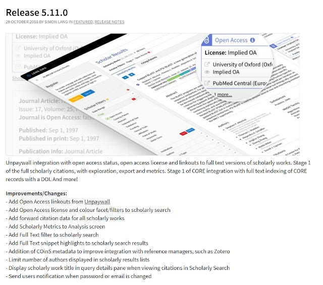 Lens release 5.11.0 adds unpaywall intergration, Scholarly citations from MAG, CORE full text for search snippets, COins for Zotero support and more