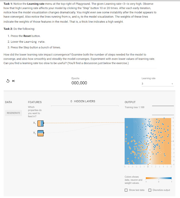 The best thing I like about the course is it's interactive "playgrounds" where you can play around with parameters like learning rates to get a feel of how different parameters affect machine learning results. Below is a interactive playgroun showing the impact of learning rate on loss.