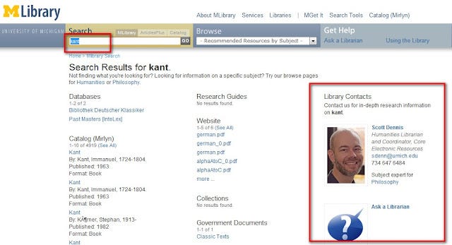 "When you do a search on the University of Michigan Library's web site, you get not only results from the catalog, web site, online journal and database collections, and more, you also get a librarian who is a subject specialist related to your search term. While the matching is not perfect, it provides a human face on search results. So, for example, if you search for "Kant," in addition to books and databases, you also get the subject specialist librarians for humanities and philosophy." "Putting a Librarian's Face on Search"