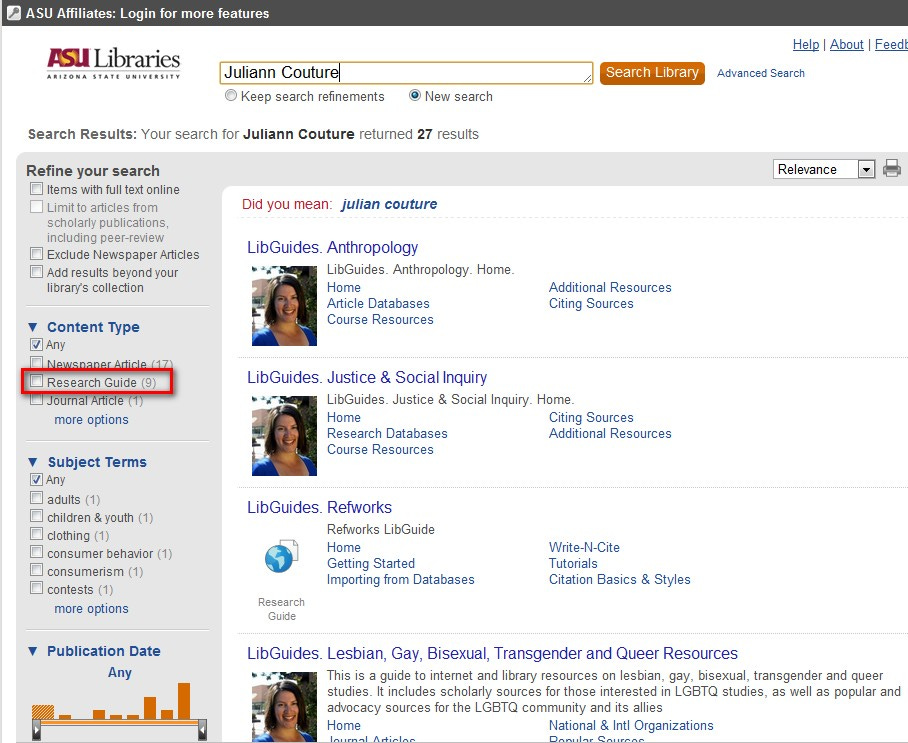 Below is an example, where a search of the librarian name at ASU, brings up libguides created by the librarian.