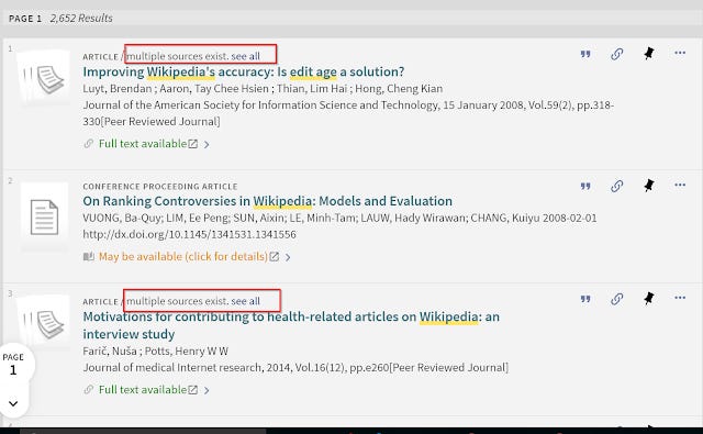 For instance, Primo might have the metadata for a paper from Wiley - the main publisher as well as metadata for the same paper from JSTOR or aggregators like Proquest and it cleverly clusters them and shows them only once , instead of multiple times in the search results.