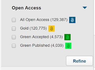 Let's shift gears and look at a recent new feature release by Web of Science, where they rolled out a improvement that allowed users to filter results by the type of Open access using oaDOI technology (which is used in Unpaywall as well).