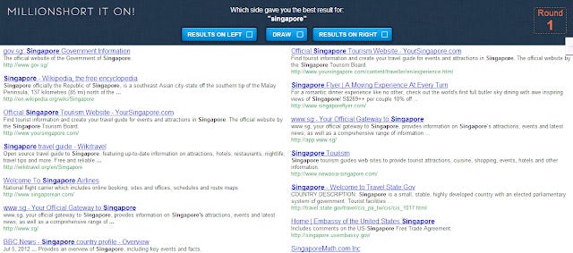 Through the magic of APIs, they pipe in the results into a webpage with 2 set of results side by side and users are asked to express a preference, or decide that they can't choose between the two.