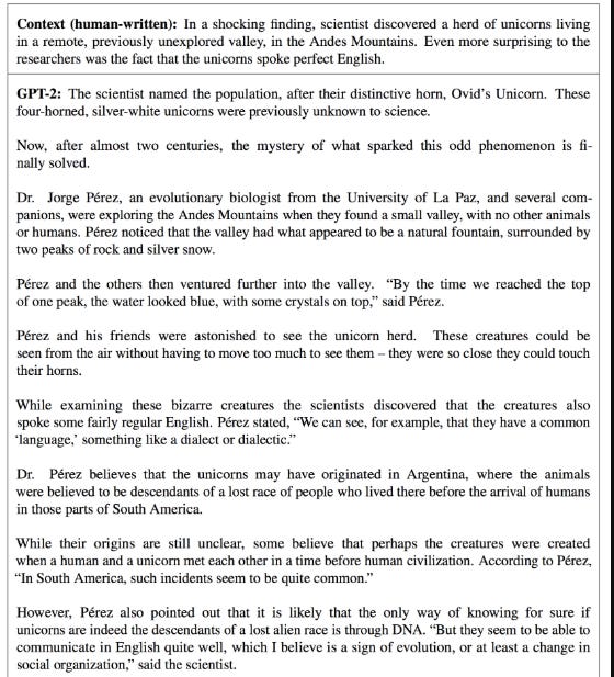 When given a prompt of two sentence on a surprising finding of unicorns in the Andres Mountains , GPT-2 came up with a really coherent story.
