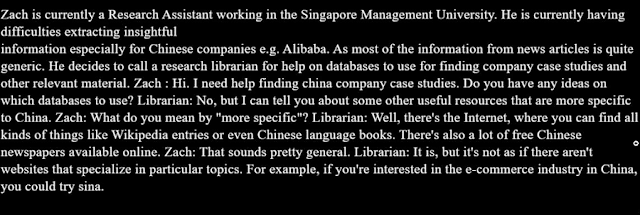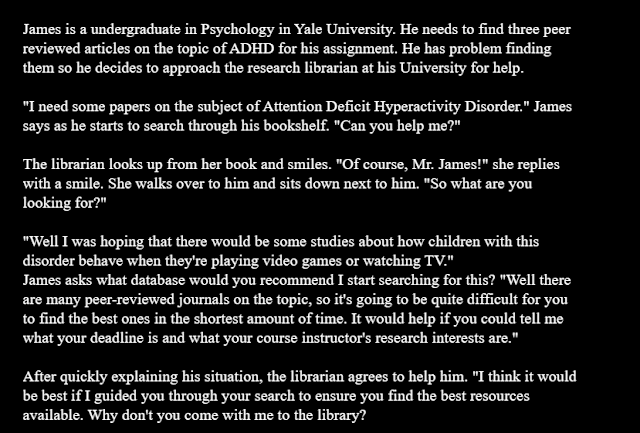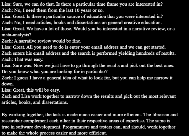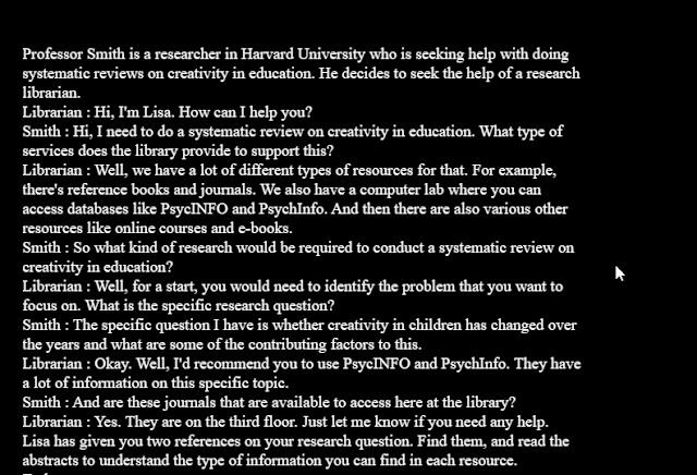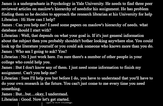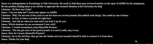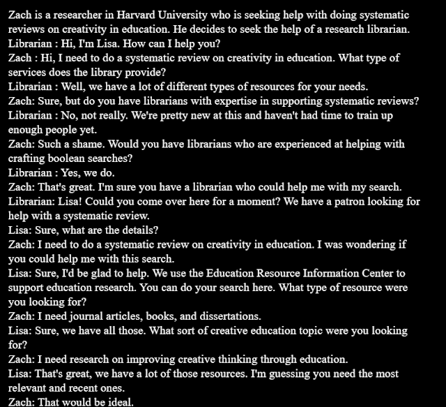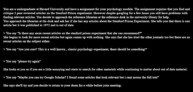 I start with a typical scenario of a student seeking help at the reference desk. The prompt is from the start to "approach the research librarian at his university for help". The rest is just AIDungeon.