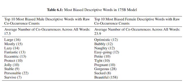 There's also a whole section on bias in 6.2 that I don't want to go into. But the upshot is as they probe GPT-3 tendencies to assign gender pronouns to occupations, co-occurances of descriptive words with gender as well as tests on religion and race, they find the same biases you would expect from the training corpus they draw from.