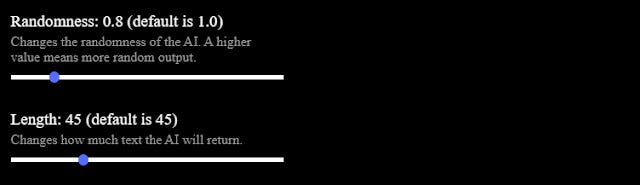 Set Randomness to lowest if you want the most probable answers, while length controls how long each segment of text is when you auto-complete.