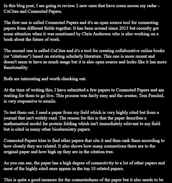 Here I tried to autocomplete this blog post on Cocites and Connected Papers .I entered the title and the first paragraph of my text. In the image below, the last prompted line "In this blog post, I am going to review 2 new ones that have come across my radar - CoCites and Connected Papers." is shown and the autogenerated text begins in the second paragraph.