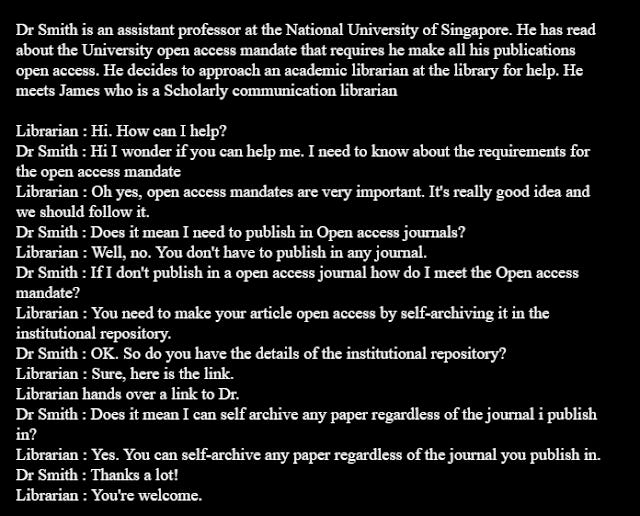 Fascinating, the AI starts sassing out the user for no reason. While trying various iterations of this, there are a number of times the AI makes the librarian pretty unhelpful, saying they don't know anything about the question. For example look at the example below where the librarian has zero clue about open access mandates :)