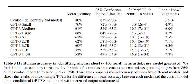 This was found when GPT-3 was tested on it's ability to generate a news articles given the prompt of a title and subtitle. (Do note this is a many shot test, because given just a title and subtitle GPT-3 tends to want to create a tweet so they include three previous news articles as a prompt for context)
