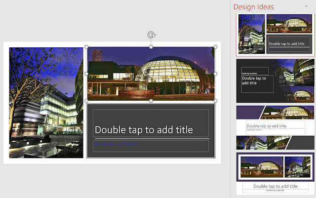 In the example below, I chose a blank template (it works with some but not all templates), copy and pasted a photo of my library building into the slides and then went to Design -> Design ideas and lo and behold you see the system automatically generate suggested layouts.