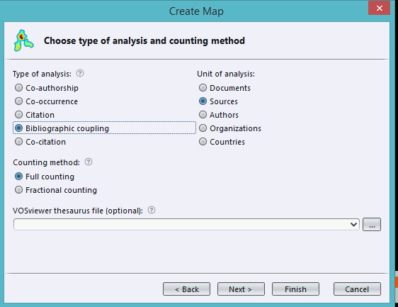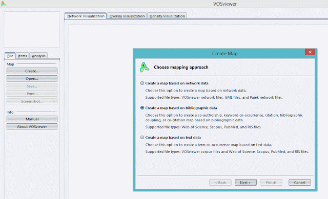Less often is when you take the third option to create a map based on text data (e.g. analysis of abstracts and titles). The tool is flexible enough to accept WOS/SCOPUS/RIS/Pubmed data.