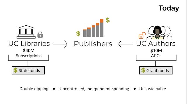 But what transformative agreements that UC and other institutions are negotiating for goes beyond this. The idea roughly is that there is enough money in the system right now (aka the money we pay to publishers) to shift to a business model where we pay publishers for publishing our authors papers open access rather than access for reading.