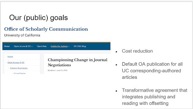 While cost saving is listed as the first point (also see later what this actually means), we see the goal of making default OA publication for all UC corresponding authors as well as "transformative agreement that intergrates publishing and reading with offsetting"