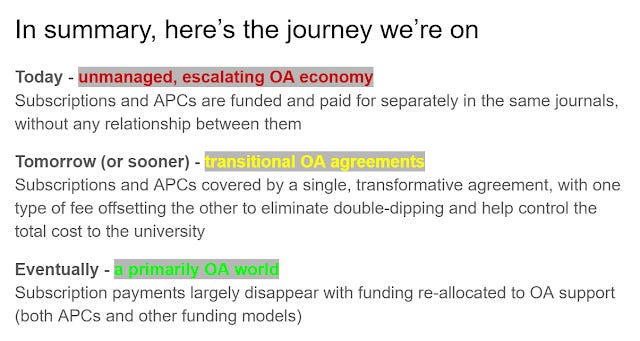 In any case, transformative agreements are quite complicated compared to normal big deals for just access and I am still trying to understand the nuances. If you are interested in learning more about transformative deals, I highly recommend "Transformative Agreements: A Primer" by Lisa Hinchliffe.