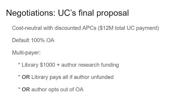 In case you are wondering this isn't a radical idea, such deals have been signed by the big publishers in the past before, including Wiley with German consortium, UC themselves signed a RAP deal with Cambridge University Press days after this talk.