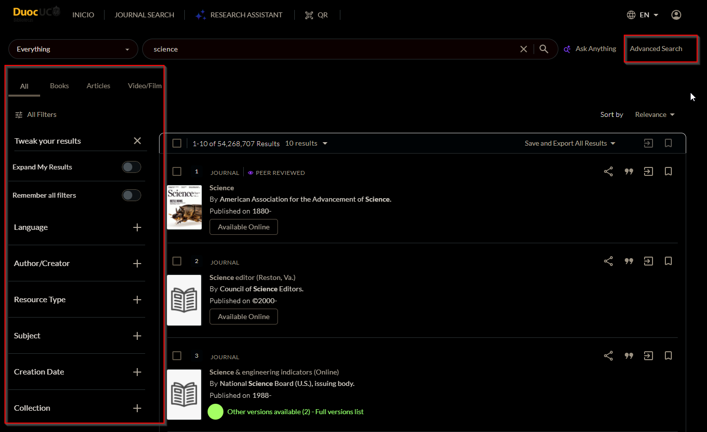 Not only does the Natural Language Search generate queries from free text, it also identifies certain catch words in the text that can be used to define the scope and automatically select the appropriate filters for the search. For example, if the term “journal” appears in the text, the scope of the search is limited to journals, and if a language is specified, the language filter is automatically turned on.