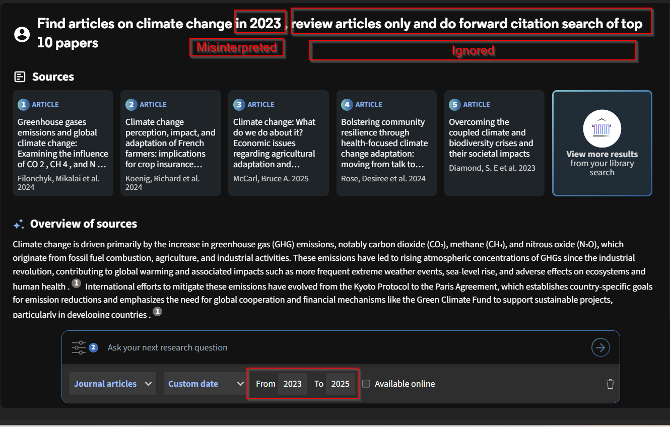 The “Surface Skimmer” (e.g., Primo Research Assistant): This tool might process the same query very differently despite being from the same company. While it can actually “understand” and parse the input to set the publication year ranges but does it know what “peer-reviewed” means as a metadata filter? (Spoiler : it does!). Or will it just look for the phrase “peer-reviewed” in the text? The user has no way of knowing. Also, can it sort by citation counts (Spoiler: it cannot).
